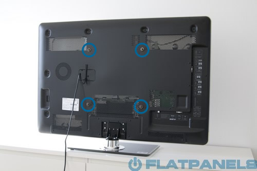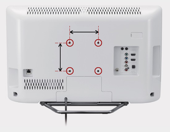 Bagsiden af TV’et med VESA-hullerne markeret med cirkler.