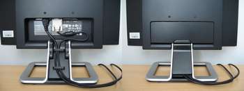 Det sidder en smart kabelholder på bagsiden, som faktisk er en af de mest praktiske jeg endnu har set. Man kan tage to små låger af og på den måde skjule kablerne let og elegant. Se billede herunder.