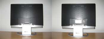 Bagsiden af skærmen er ligeledes udført i plastik, men overfladen har et slags mønster af små runde punkter. Stikkene indsættes i bunden og kan skjules godt af vejen. Først kan man afmontere en lille plade, hvorunder man finder input til USB hubben, DVI og VGA indgangen, lydindgangen, samt strømindgangen. Udgangene fra USB hubben sidder også her, og man ville måske mene det havde været mere praktisk, hvis de ikke sad bag pladen. Det betyder nemlig, at man skal have pladen af hver gang man vil montere en USB enhed.