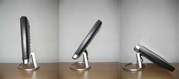 Foden er ikke helt lige så kraftig, som skærmens ramme, men virker alligevel passende i den samlede konstruktion. Jeg savner dog nogle ergonomiske muligheder. Det er kun muligt at tilte skærmen frem og tilbage og højdejustering ville være kærkomment. Du ser herunder tre billeder. Det første er skærmen i den størst mulige fremadrettede tilposition. Det andet billede er den størst mullige bagudrettede tiltjustering før skærmen vælter eller ikke står stabilt længere.