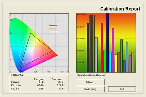 Efter kalibrering sænkede jeg sort til 0,4 cd/m2. Det giver et kontrastforhold på 600:1 (+/- 66). En dybere sort er klart at foretrække i forhold til meget lysstærk skærm.