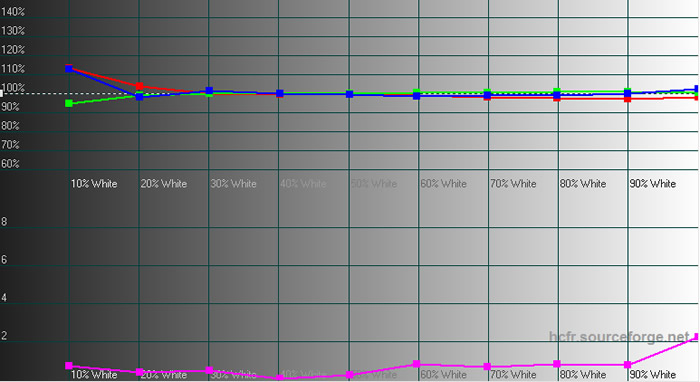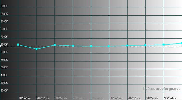 Det justerede billede ser nu noget bedre ud, med deltaE-værdier under ca. 2 over hele skalaen og vi rammer farvetemperaturen på 6500 K ret pænt. Det var nødvendigt, at skrue et par takker ned for farvetemperaturen, hvilket B&O ikke kan genkende fra deres kalibrering af lige netop vores eksemplar. Uden justering af farvetemperaturen rammer vi lidt højere end 6700 K. Vores version af firmwaren tillod justering af farvetemperaturen når lyssensoren var slået fra, men dette var ikke muligt på den på daværende tidspunkt tilgængelige officielle firmware fra B&O. Alt i alt et ret flot resultat.