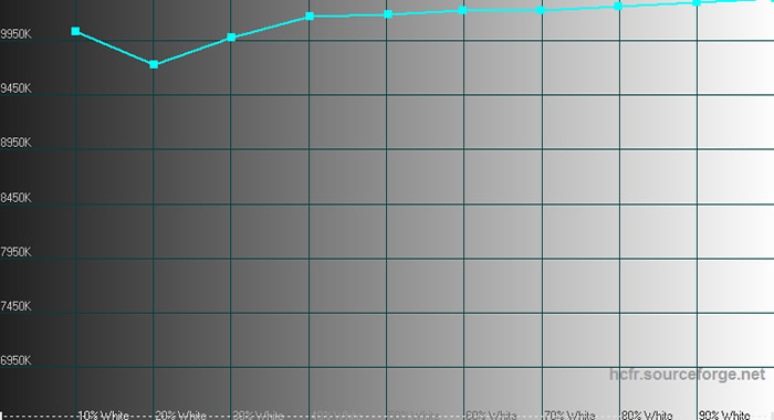 Dette bekræftes ved at kaste et blik på temperaturkurven, hvor vi måler tæt på 10000K farvetemperatur. Dette er som nævnt ikke usædvanligt for B&O, men det er ret langt fra det D65 hvidpunkt man normalt sigter efter, som har en temperatur på 6500K.