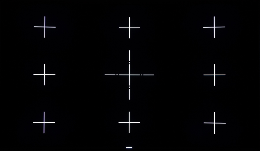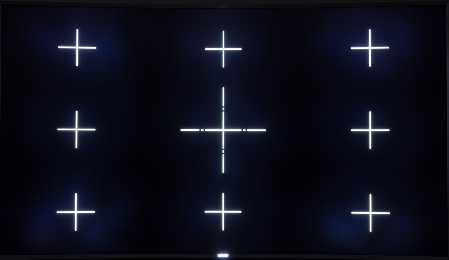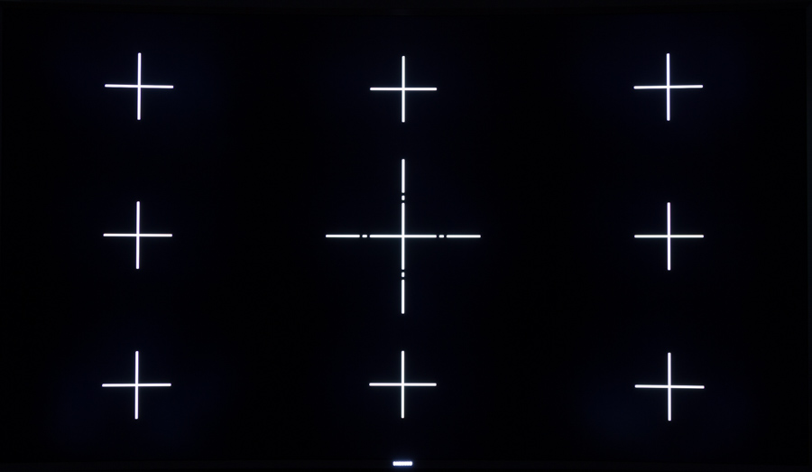 Hvis vi ser lidt nærmere på selve panelet, så kan vi lægge ud med at se på de 240 zoners lokal dimming, som JS9505 er udstyret med. TV’et var generelt ret god til at styre disse zoner, hvilket historisk set har været lidt af en opgave, som producenterne tidligere har haft blandet held med at mestre. På JS9505 har man dog nået et niveau, hvor de fleste blooming-artefakter kan undgås så længe man holder “Smart LED” på enten “Standard” eller “Lav”. Billedserien herunder viser hvordan de lokale zoner af LED opfører sig når der vises lyst indhold på mørk baggrund. I praksis er det 2 sekunders eksponeringen, som kommer tættest på oplevelsen i stuen, hvor 8 s og 13 s er medtaget for at vise hvordan zonerne forsøger at oplyse de hvide krydser lokalt. Sortniveauet havner da også i ca. samme område som vi har set tidligere, så der er ikke så meget nyt her ud over, at TV’et kan skrue helt ned for lyset lokalt.