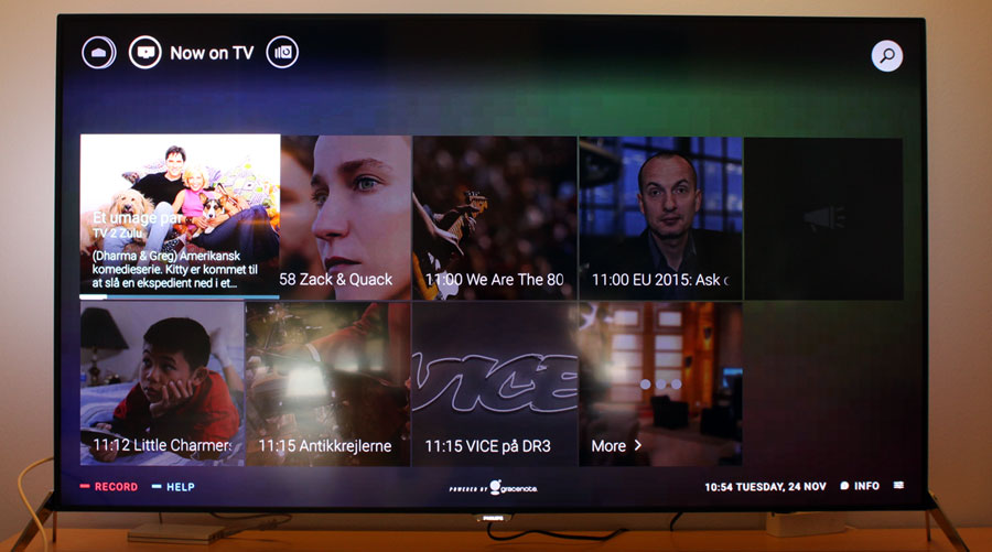 Google dikterer, hvordan Android TV brugerfladen skal se ud, men det strækker sig ikke i særlig stringent grad til tv-kanalerne. På Philips’ skærm kan du navigere tv-kanaler ved at trykke på et af numrene på fjernbetjeningen eller ved at tilgå tv-guiden. Tv-guiden har en høj bannerannonce i venstre side, der viser annoncerer for bl.a. apps og spil - det var vel forventeligt med Google om bord. Det meste af tiden modtog vi en annonce for Netflix’s Jessica Jones tv-serie.