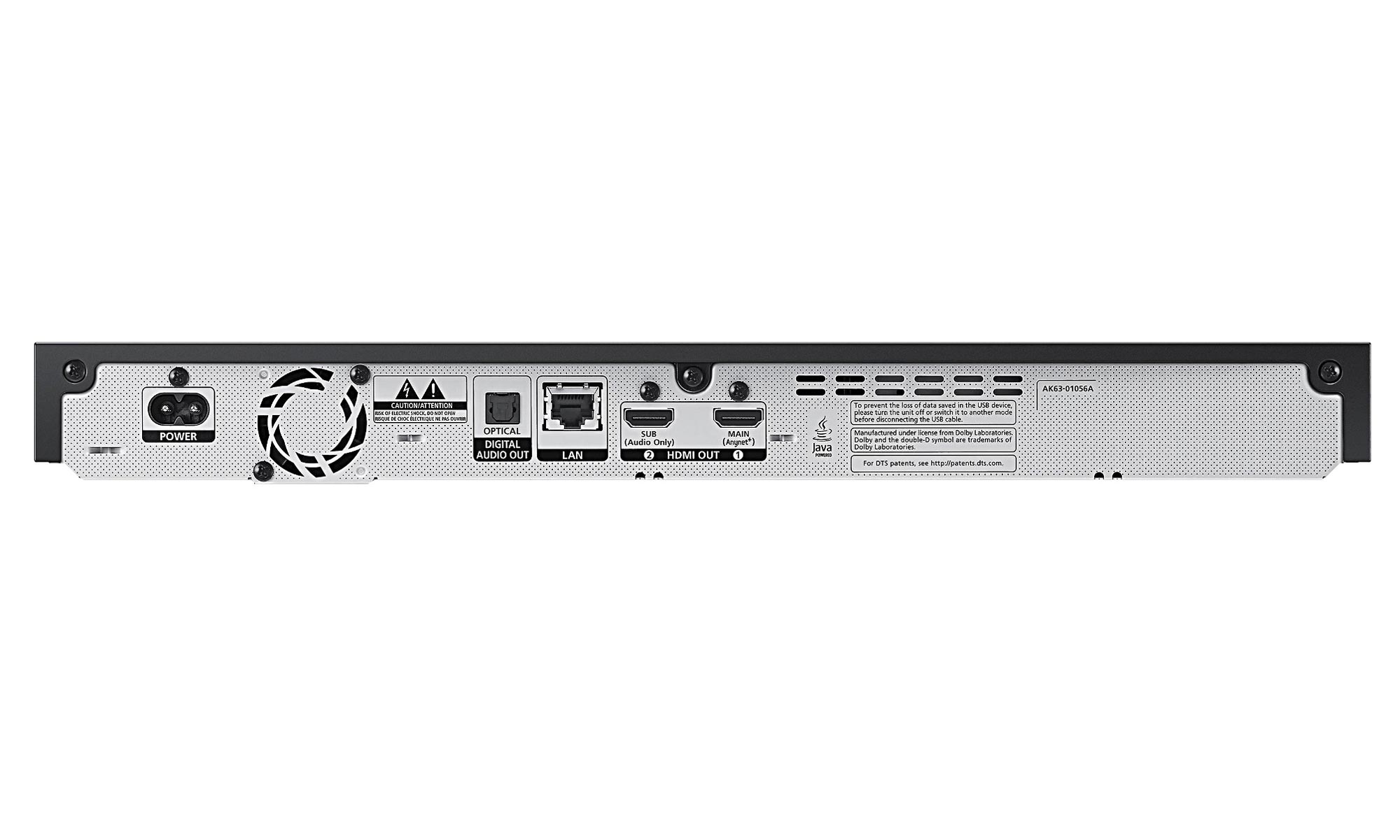 Der er to HDMI-porte på bagsiden; en til billede og en til lyd. Herudover finder man optisk lydudgang, men hvis du har planer om at nyde HD-lyd, så skal du bruge HDMI-porten. Du behøver i øvrigt ikke nye HDMI-kabler til UHD Blu-ray-afspillere, dine gamle er helt fine – uanset hvad forhandleren fortæller dig! Der er heller intet HDMI-kabel i kassen. Strømforsyningen er integreret så alt hvad du har brug for at et strømkabel. Der er inkluderet et vinklet strømkabel i kassen, men strømudtaget på boksen er lidt klodset placeret. Enten dækker strømkablet noget af blæserudgangen eller også stikker det ud over afspillerens ydrekant.