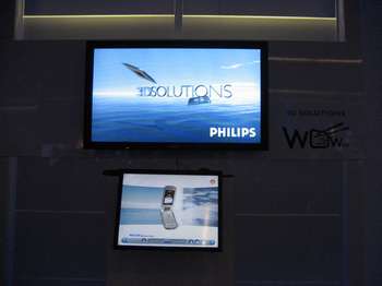 Philips præsenterede også deres WOWvx teknologi, som kan gengive 3D billeder. Det er umuligt at fange på et kamera, men her en illustration af præsentationen. Teksten på den øverste skærm drejede rundt og det så ud som om, at det kom ud af billedet. Effekten var ikke virkelig overbevisende, men den var der. Man skal dog stå ligefor skærmen ellers fungerer det ikke.