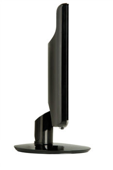 Skærmens design er også noget utraditionelt i dets form, og med den usymmetriske fod, skal V2400W nok skabe opmærksomhed rundt omkring. Rammen er udført i blank, sort plastik og nederst til venstre sidder en række knapper.