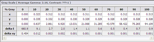Målingerne for hver IRE-værdi kan ses i tabellen herunder. x og y koordinaterne relaterer til CIE-diagrammet, som vi viste før, hvor målet er at ramme den nævnte D65 værdi. (x,y)-koordinaterne til denne værdi er (x=0.313, y=0.329). For hver af disse målinger findes der desuden informationer om RGB værdier og meget mere, som vi ikke vil komme ind på her. I tabellen vil du måske også genkende"delta E" benævnelsen, som vi også benytter i vore tests. I dette tilfælde er værdien dog ikke angivet for individuelle farvenuancer, som det er tilfældet i vore test, men derimod som en middelværdi for de tre grundfarver ved en given IRE-værdi. Samme regelsæt gælder dog for disse delta E værdier, således at en værdi under 3 betyder, at farven er så tæt på målet, at man ikke kan se forskel med det blotte øje, og værdier over 3 angiver at der vil være synlig forskel på korrekt gengivelse og den målte.