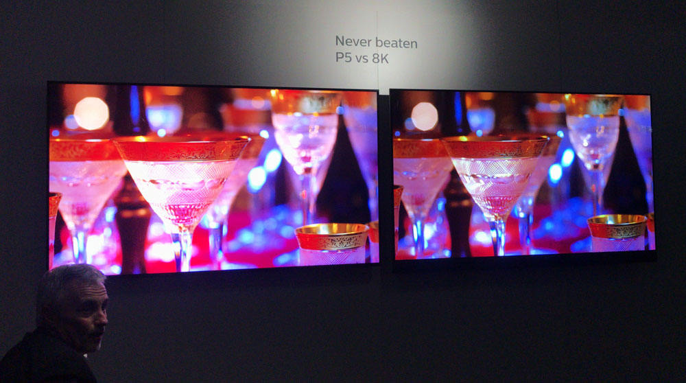 Afslutningsvis ønskede Philips at vise, at 8K ikke løfter billedoplevelsen ift. 4K på nuværende tv-skærme. Danny Tack understregede, at han ikke forsøgte at træde på Samsung (hvis TV blev anvendt i sammenligningen), men blot at demonstrere, at såfremt man ser 4K-video opskaleret til 8K (på Samsung Q900R), så er et Philips 4K OLED ”never beaten” – aldrig slået. Begge skærme var i Dynamisk profil, men budskabet gik alligevel klart ind for tv’et fra Philips var tydeligvis det bedste af det to, hvilket i høj grad kan tilskrives OLED-teknologiens styrker.