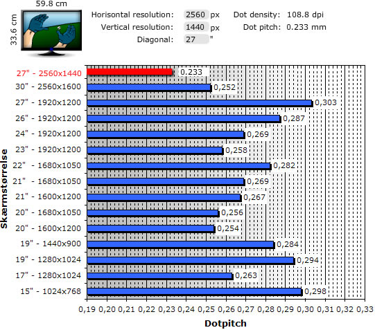 Herunder kan du se dotpitchen for de mest almindelige skærmtørrelser og selv indtaste skærmstørrelse og opløsning for at få vist den tilsvarende dotpitch. Læg mærke til at de sidste nye 27”" skærme har en ret høj dotpitch ift. de mindre modeller.