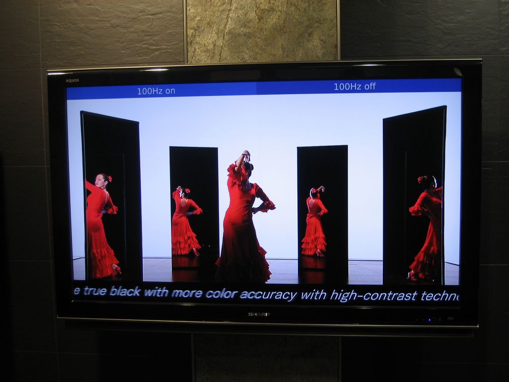 Sharp havde desuden en præsentation af deres 100 Hz system. Det blev demonstreret på en skærm, hvor halvdelen af skærmen havde det aktiveret og den anden halvdel ikke havde den aktiveret. Demonstrationen viste ret tydelig en forskel, selvom der nok var fiflet lidt med skærmen for at demonstrere en ”stor” forskel.