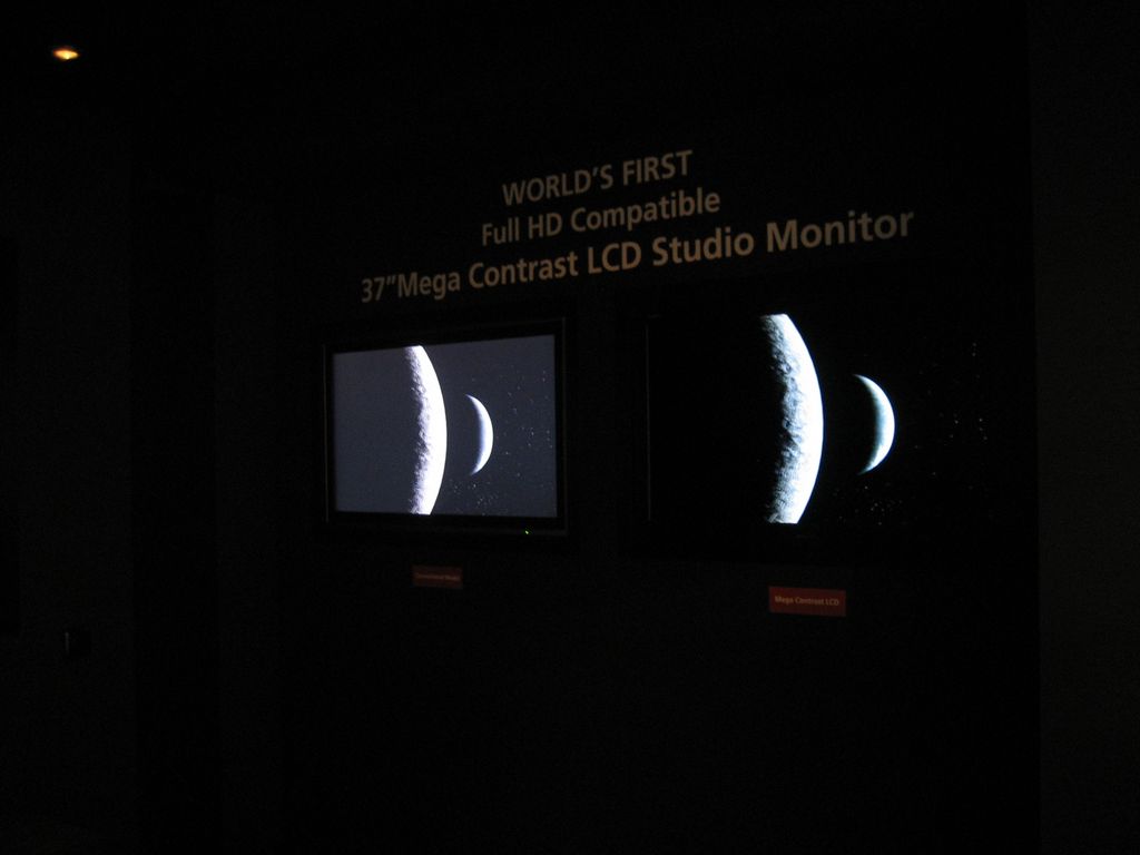 Før vi bevæger os til nogle af de konkrete modeller, kigger vi lige hurtigt på Sharps Mega Contrast, som blev fremvist i et lille mørkelagt rum. Herunder ser du først en sammenligning med et traditionelt LCD panel og så Mega Contrast skærmen.