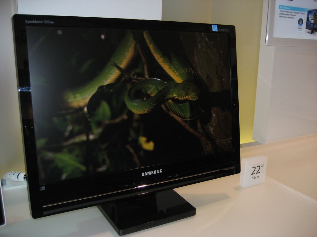 Det første jeg stødte ind i var en 22 tommer monitor/Tv. Man har kombineret en af de populære 22 tommer PC monitors med en tuner, HDMI, DVI, D-SUB (VGA), komponent, s-video, komposit og scart indgang, samt en analog tuner, og således skabt en fusion mellem de to typer skærme.