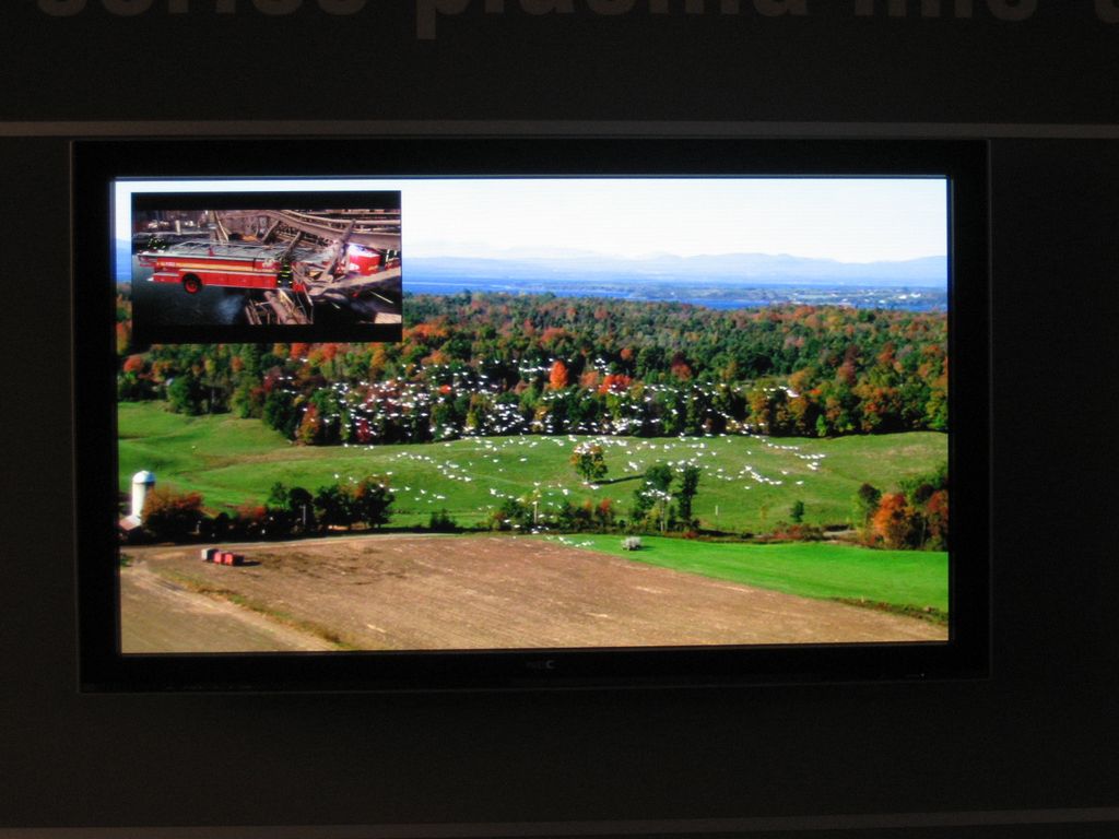 Det er specielt tydeligt på panorerende tekst, om end jeg ikke helt kunne genkende samme slørede tekst på Sharps nuværende hurtige LCD-TV paneler. Som du kan se på billedet ovenfor fangede jeg meget godt demonstrationen med kameraet. Herunder et billede mere.