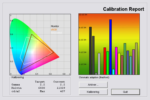 Som du kan fornemme ud af grafen, er der størst afvigelser for de mørkeste toner i billedet. Grundene er blandt andet, at sort ikke gengives så dybt, og gammaen er for høj og ikke helt i balance.