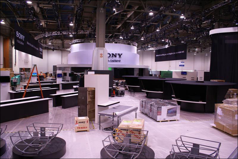 Sony er på billedet herunder ved at sætte deres CES 2010 stand op, som vidner om et spektakulært show. Standen er i øvrigt endnu større end den Sony havde på IFA 2009, og den var ikke at kimse af.