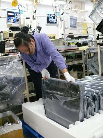 Samlingsprocessen begynder med LCD-panelet. LCD paneler ankommer fra leverandører pakket ind i plastik. Når panelerne er klar til montering, pakkes de ud af disse beholdere og placeres med billedsiden op.