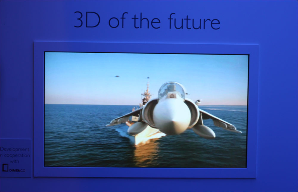 Så hvordan virker det? Tja, ikke særlig godt. Billedet er ufokuseret og detaljefattigt. Ud over, at man skal stå i den rigtige position foran skærmen, er 3D-dybden og 3D-illusionen også meget langt fra den vi ser på de nye 3DTV, der kræver 3D-briller. Faktisk vil jeg gå så langt til at sige, at jeg har svært ved at se nogen reel 3D-effekt på mange af klippene, ud over, at man godt kan fornemme, at der er nogle små dybdeforskelle. Omvendt virkede visse klip - f.eks. det med flyet herunder - nogenlunde, dog uden at være imponerende.Dimenco – som udvikler denne 3D-prototype for Philips – mener, at man kan have en model klar til forbrugerne allerede i 2013. Dimenco siger også, at vejen mod en forbrugermodel allerede er klar, men at skærmen skal lanceres til professionelt brug inden da. Philips prototype af en 3D-skærm uden 3D-briller er dog langt fra overbevisende. Vi kan hvert fald sige uden tøven, at 3D-skærme uden 3D-briller er ret langt fra at være en aktualitet med denne teknologi. Kvaliteten er hvert fald ikke særlig god endnu. Modellen har før været fremvist på messer, og personligt har jeg ikke set nogen større forbedringer år for år. Philips har også 3DTV på markedet, som kræver 3D-briller, ligesom de andre producenter. En af disse modeller er 8605H-serien.
