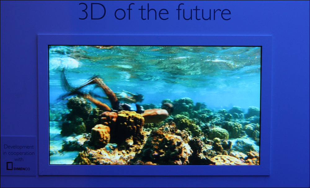 IFA 2010 handler ikke kun om nye produkter. Producenterne præsenterer også fremtidens teknologi og elektronik-koncepter. Derfor havde Philips i samarbejde med Dimenco medbragt en prototype af en 3D-fladskærm, som ikke kræver 3D-briller. Teknologien er baseret på det såkaldte lenticular lens, som vi kender fra cornflakes-pakkerne. Når billedet betragtes, skydes lyset ud i små afvigende vinkler, så øjnene modtager forskellige billeder, og derved kan skabe en illusion om dybde i billedet. Ulempen er, at man skal stå i ”sweetspot”, altså foran skærmen i det rigtige punkt. Philips siger, at skærmen har 15 punkter, hvorfra 3D-billedet kan ses, men ind i mellem disse punkter, ser billedet mystisk ud. Selve skærmen er 56 tommer stor, baseret på LCD og har en opløsning på 4Kx2K (fire gange højere end Full HD).Virker ikke optimalt