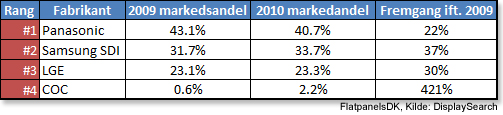 Plasma-Tv er populære blandt billedentusiaster, selvom det på global basis er LCD/LED-fladskærme, som trækker det store læs. I 2010 blev der i alt solgt 19,1 millioner plasma-Tv sammenlignet med 14,8 millioner i 2009 og 15,1 millioner i 2008, melder det anerkendte analyseselskab DisplaySearch.Panasonic er stadig ledende på plasma-Tv markedet med en markedsandel på 40,7 %. Samsung er nummer to med 33,7 % og LG nummer tre med 23,3 %. Panasonics markedsandel er imidlertid faldet i forhold til 2009, mens Samsung og LG er gået frem.