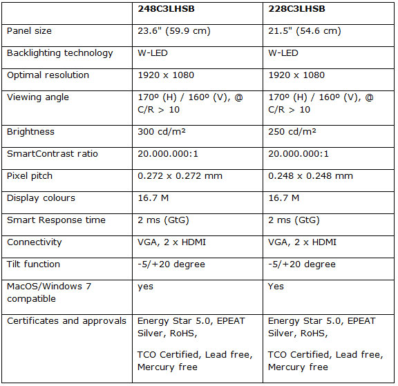 Philips 248C3LHSB og 228C3LHSB er i handlen om få uger. For priser se 24” 248C3LHSB her og 22” 228C3LHSB her.