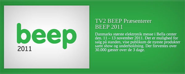 Beep 2011 er Danmarks nye forbrugerelektronikmesse, og i et tæt samarbejde med TV2, skal messen afholdes 11-13. november i Bella Center, København. Her får du mulighed for at se og prøve en lang række produkter fra de store elektronikproducenter.
