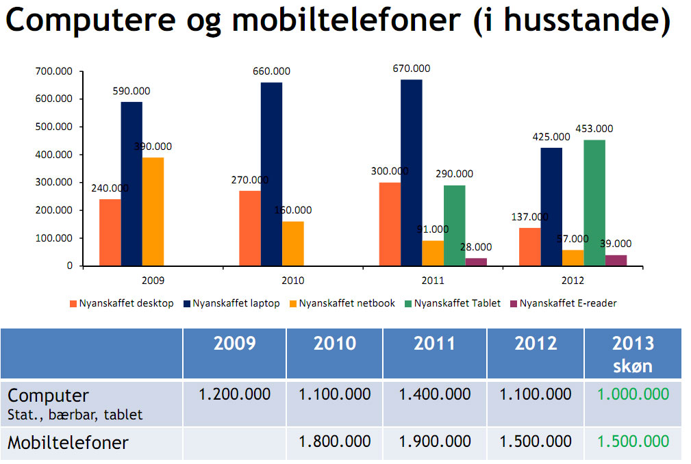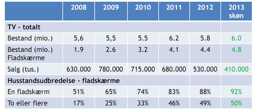 Der købes færre tv-skærme i Danmark, og ligeledes købes der færre tv-bokse, Blu-ray-afspillere og radioer. Smartphones og tablets er derimod populære blandt danskerne.Paradoksalt nok berørte finanskrisen for nogle år tilbage ikke salget af tv-skærme i Danmark. Nærmere tværtimod. I 2013 forventes der dog at blive solgt færre tv-skærme end i en del år. Det forventes at danskerne vil købe 410.000 tv, og det forventes også, at der vil stå et fladskærms-tv i 92 % af de danske hjem. 410.000 er cirka samme niveau som i 2006.