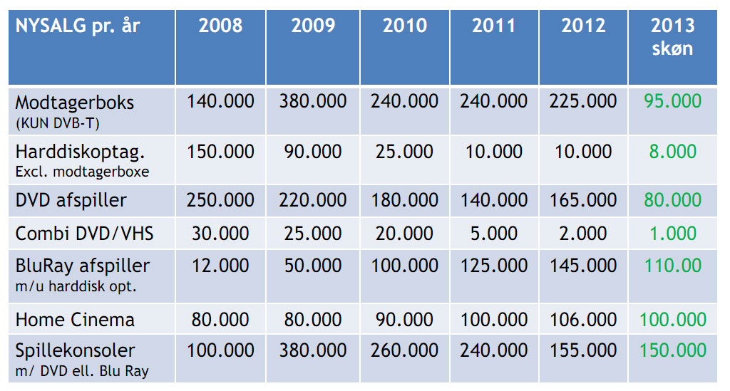 Der købes færre fladskærms-tv i DanmarkDet er dog ikke kun tv-salget der er nedadgående. BFE beretter, at også tv-bokse, afspillerbokse, HiFi og meget andet er nedadgående. En interessant detalje er, at salget af harddiskopdatere nærmest er gået i stå. Formentlig pga. at mange danskere har optagefunktion i deres tv-boks fra tv-udbyderen eller direkte i tv-skærmen. BFE fortæller desuden, at tv-skærme i dag udgør 50 % af salget (PC, smartphone, tablet undladt) målt på styk og hele 75 % målt på omsætning. Det er første år, at salget af Blu-ray-afspillere overhaler DVD-afspillere i Danmark, men samtidig ser det også ud til at Blu-ray-salget allerede har toppet. Blu-ray har aldrig nået den samme popularitet som DVD, og i takt med at flere streamingtjenester er kommet til, vælger danskerne dem over fysiske medier. Fremadrettet ser branchen dog flere triggere, som kan bringe købelysten tilbage. Salget af spilkonsoller forventes faktisk at falde i 2013 selvom der kommer en PS4, men den kommer naturligvis også sent på året og vil derfor først for alvor slå igennem i de kommende år.