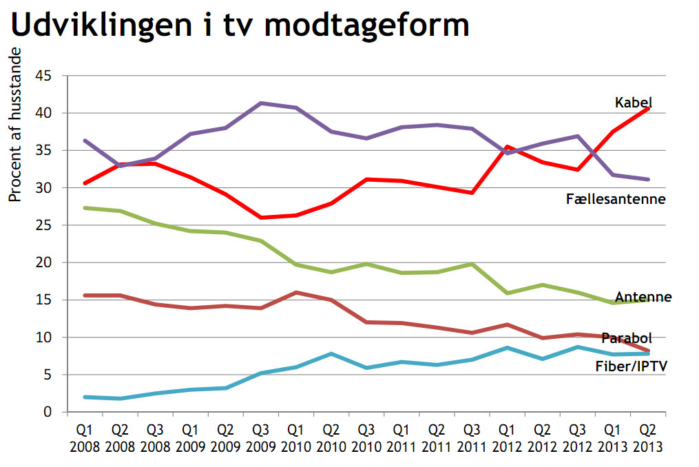 BFE talte også om trends indenfor tv-udbydere, hvor kabel-tv fortsætter sin fremgang. 40 % af de danske husttande har nu kabel-tv. Det skal samtidig noteres, at de lidt over 30 % der er tilsluttet gennem fællesantenne også i mange tilfælde får tv-signal via kabel-tv. Der kom ikke tal på bordet for streaming, men en anden interessant detalje, som er værd at bemærke er, at tv-forbruget på tv-kanaler er konstant på trods af de nye streamingtjenester. Det fortolker BFE som, at tv-forbruget i Danmark er steget kraftigt i 2013. Danskerne bruger lige så meget tid på at se tv-kanaler som de hidtil har gjort, men lægger så ekstra minutter ovenpå dagligt via streaming. Streamingtjenesterne ser således ud til at supplere i stedet for at tage tid væk fra tv-kanalerne lige nu. I de kommende år forventer man, at der bliver større valgfrihed på tv og at tv vil kunne ses fra flere enheder og uanset hvor man befinder sig.