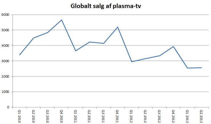 I tallene ligger dog også det lidt ærgerlige faktum, at plasma-tv er døende, på trods af at teknologien stadig foretrækkes af mange entusiaster. Tallene for 2. kvartal af 2013 viser således, at der blev solgt 19 % færre plasma-tv i forhold til samme kvartal i 2012. Tendensen har stået på i et stykke tid og ser ikke ud til at vende. Siden 2010 af er salget af plasma-tv næsten halveret.