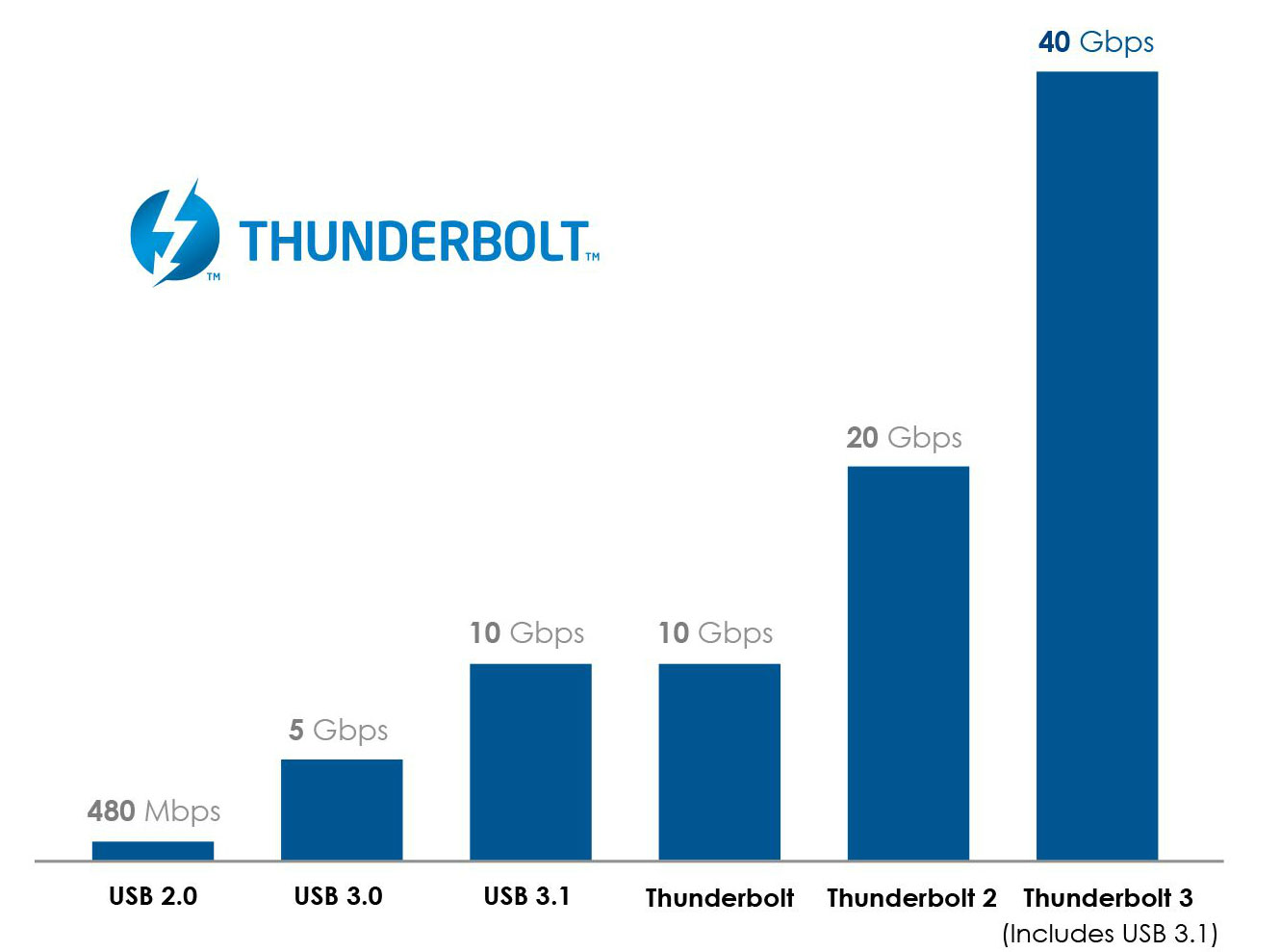 Den nyeste version af USB har overførselshastigheder på op til 10 Gbps. Thunderbolt 3 klarer 40 Gbps og bruger samme stiktype som USB-C. Altså den nye type, der hvor stikket kan vendes begge veje. Det er muligt fordi Thunderbolt har små chips indbygget i kablet, der gør det hurtigere (men også dyrere).