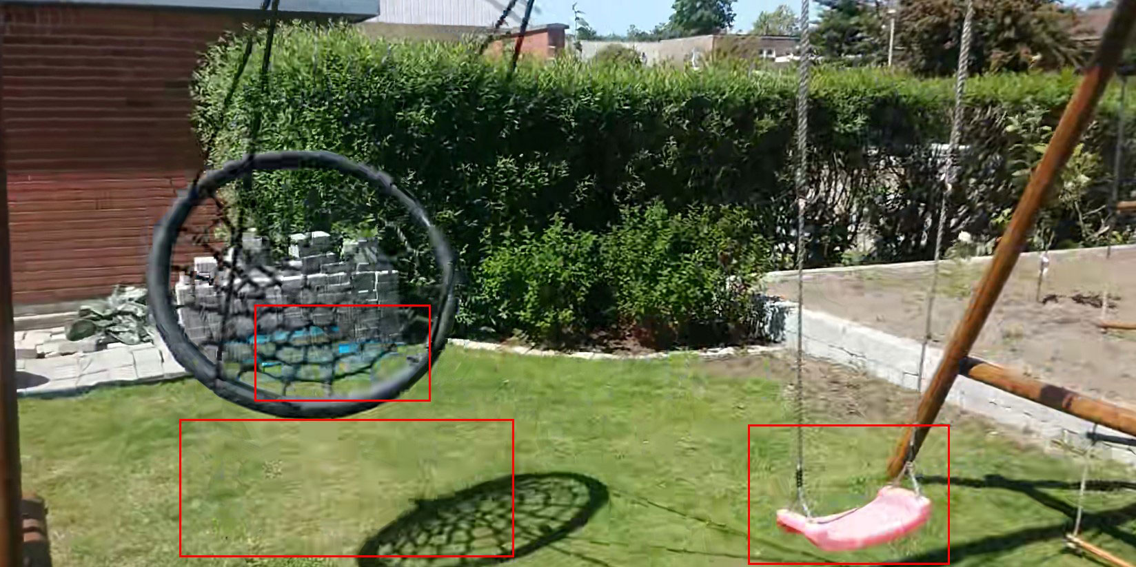I klippet ses også en svingende sansegynge, som svinger frem og tilbage. Her er der masser af bevægelse i billedet, og her skal man kigge nærmere på sansegyngen. Gyngen skal fremstå knivskarp uden uldne kanter, når gyngen svinger frem og tilbage. Ligeledes skal man kigge nærmere på græsset under gyngen - når gyngen ikke er over græsset, så skal græsset helst fremstå detaljeret og ikke som en udsmattet grøn flade.
