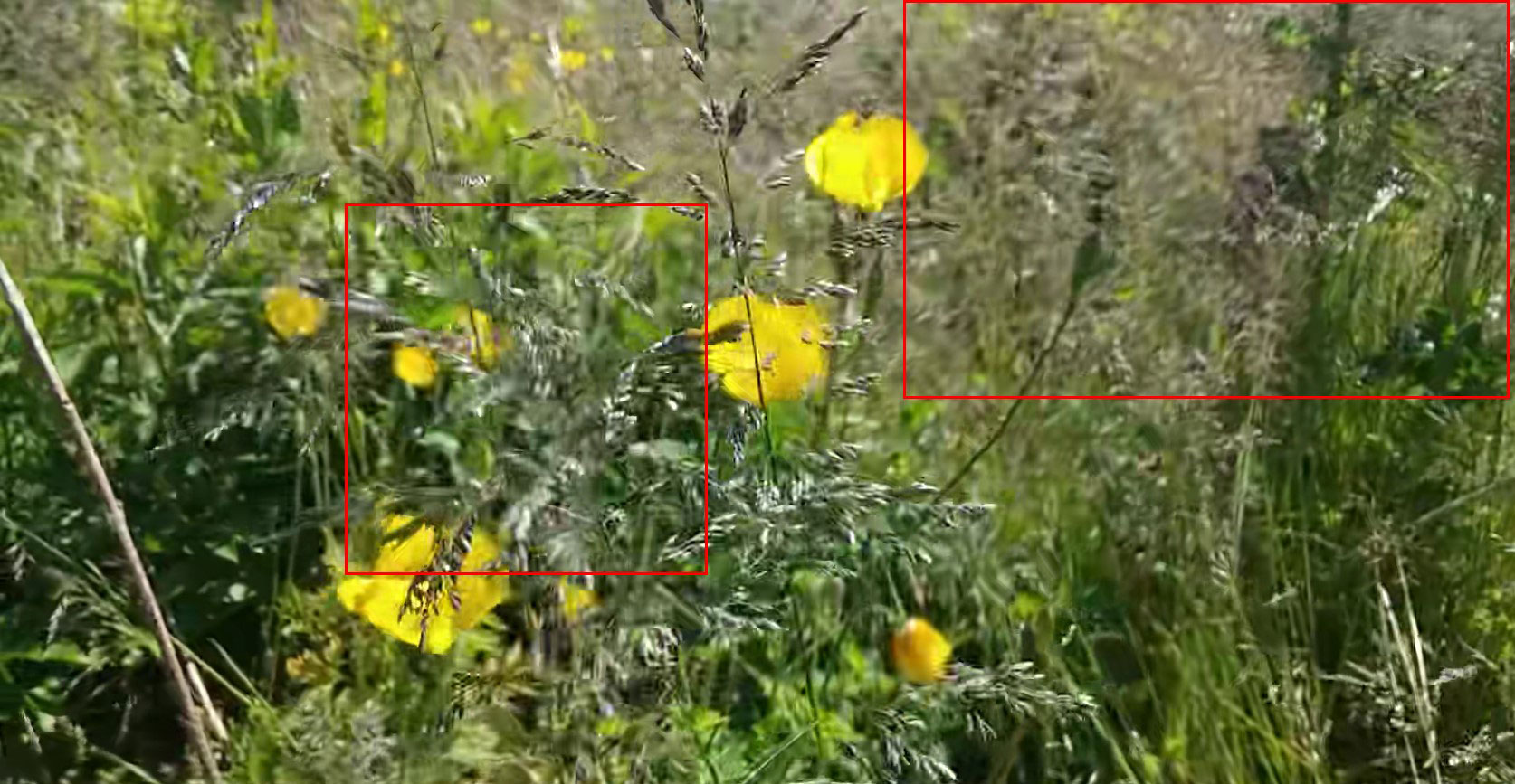 Testklip med højt græs. Her ses tydelig fejl omkring græsset i midten og øverst i højre hjørne