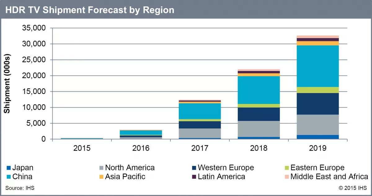 IHS forventer således, at HDR så småt vil begynde at tage fart i 2016, hvor de første UHD Blu-ray-afspillere, der alle understøtter HDR, kommer i handlen. Amazon streamer allerede visse tv-serier i HDR og Netflix begynder at streame i HDR-kvalitet i starten af 2016. Flere partner undersøger også muligheden for at bruge HDR til sport.