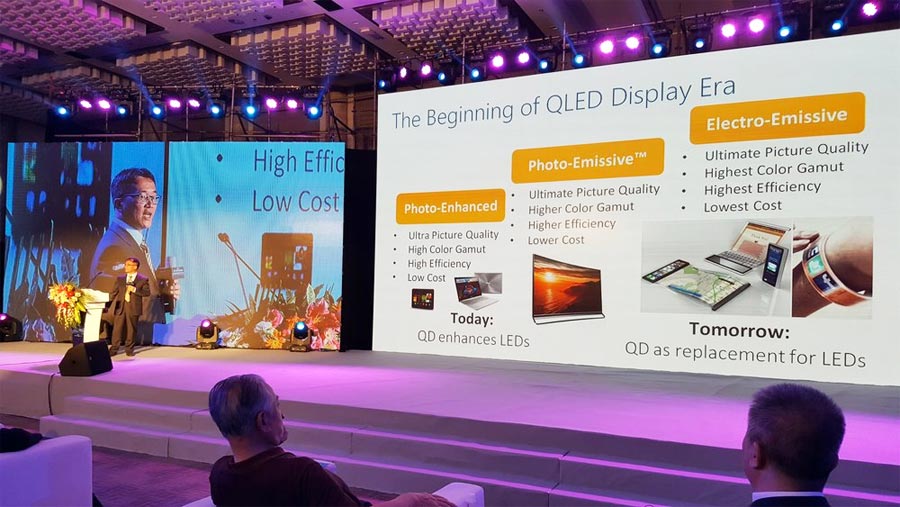 Nanosys, et af selskaberne som er involveret i forskning af quantum dot, gav ved arrangementet et historisk tilbageblik på teknologien. De præsenterede desuden planerne for fremtiden, som dækker over ægte QLED-tv; altså skærme uden LCD-teknologi, hvor quantum dots udgør det aktive element. Det er denne teknologi, som kaldes “electro-emissive QLED” i billedet nedenfor.