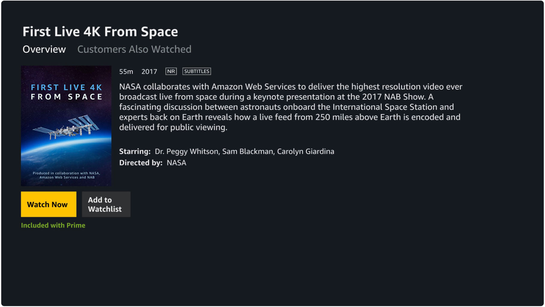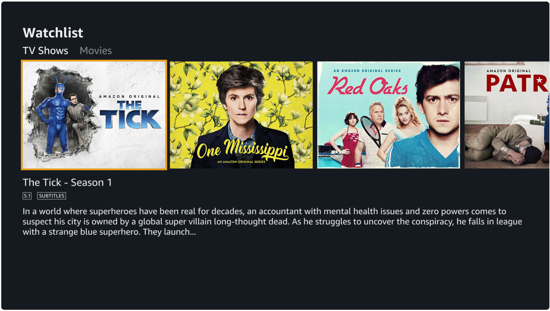 Den nye app giver adgang til Amazons katalog af tv-serier, film og dokumentarer i billedkvalitet op til 4K HDR. Brugerfladen angiver, at lyd leveres i op til 5.1 surround, men kun stereo sendes igennem. Brugerfladen er i store træk identisk med andre platforme. Der er bl.a. en ’watchlist’, så du kan gemme indhold til senere.