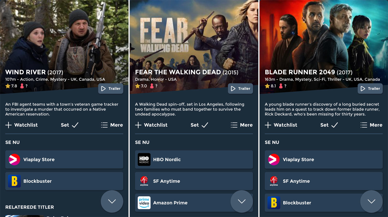 App’en fremhæver nyt indhold på hovedskærmen, men har også kategorisektioner og en søgefunktion. Søger man efter eksempelvis filmen Wind River, får man at vide, at den findes hos Viaplay og Blockbuster. Søger man efter tv-serien Fear the Walking Dead får man at vide, at den kan ses hos HBO Nordic, SF Anytime og Amazon.