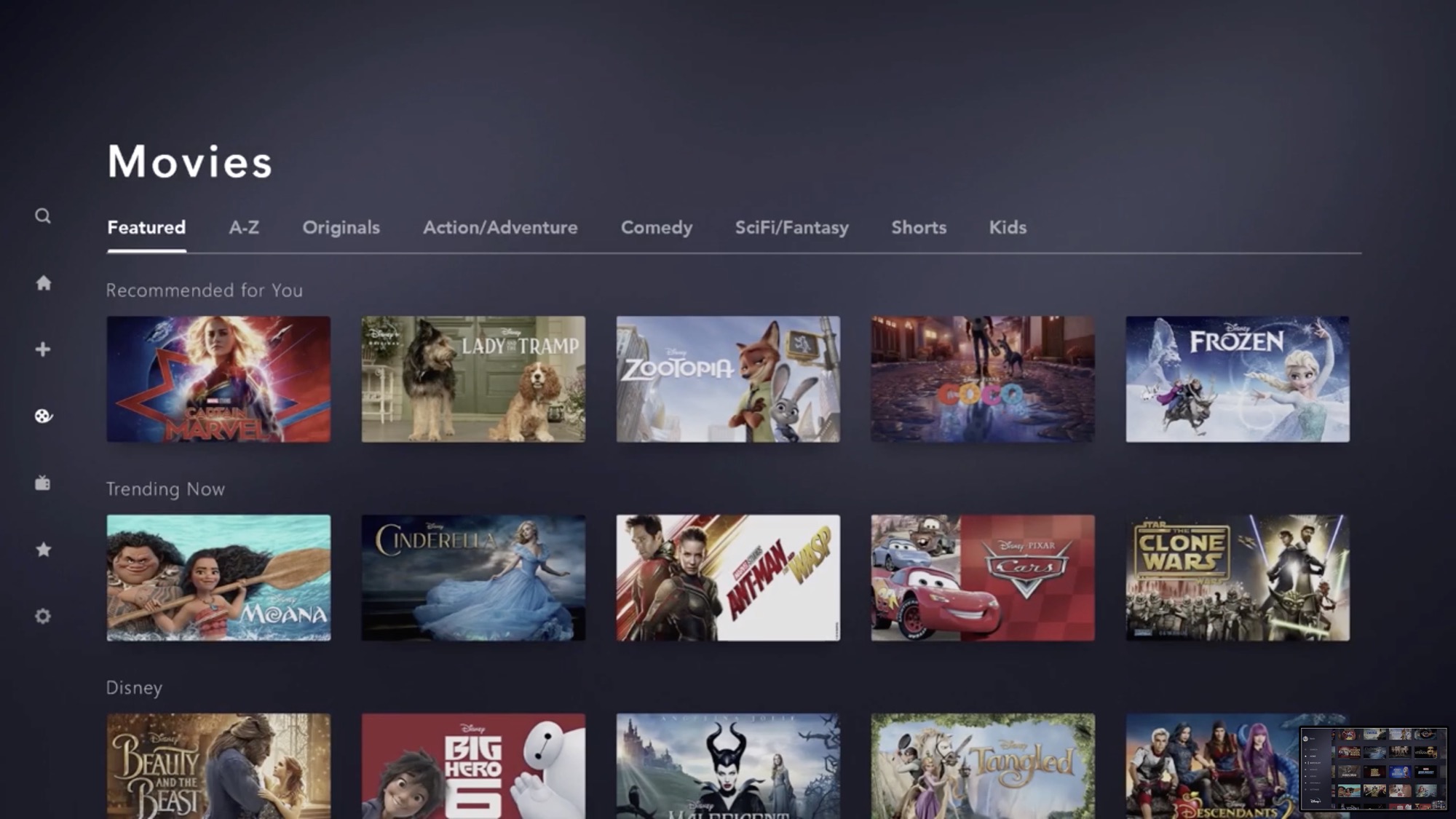 Disney+ bliver en rendyrket forbrugertjeneste, men selskabet vil stadig bygge mur om sine biograffilm under Disney og nu også Fox. De største film bliver vist først i biografen og først flere måneder senere eksklusivt på Disney+. Selskabet har store biograffilm som Avengers: Endgame, The Lion King, Aladdin, Toy Story 4, Star Wars: Episode IX og Frozen 2 på vej.