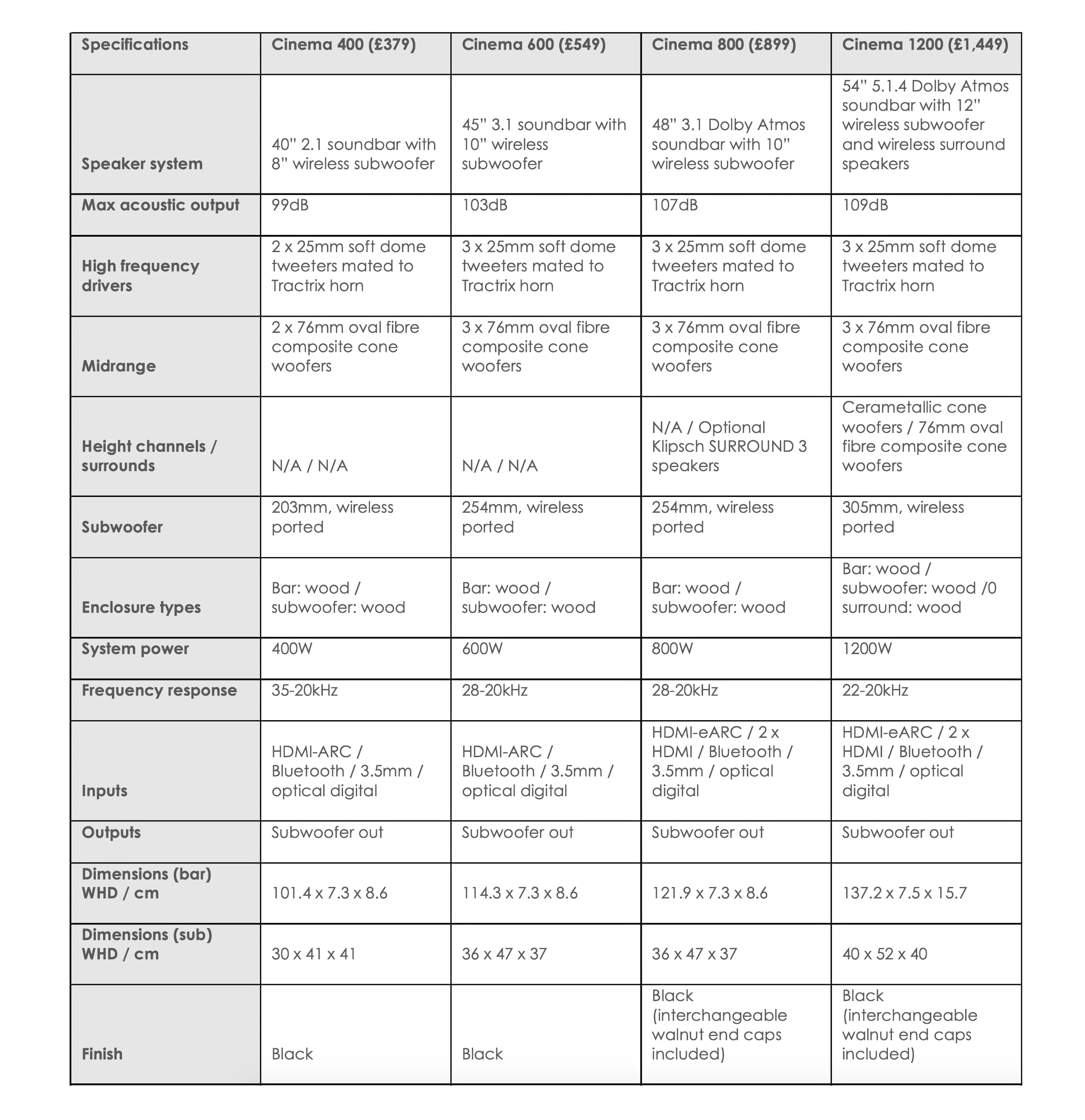 Skridtet ned til Klipsch Cinema 800 giver en 3.1-kanals soundbar med en 10-tommer subwoofer. Den kan udvides til 5.1 surround med et par Klipsch Surround 3 baghøjttalere. Den understøtter teknisk Dolby Atmos, men mangler de loft-vendte enheder, som findes i 1200-modellen.