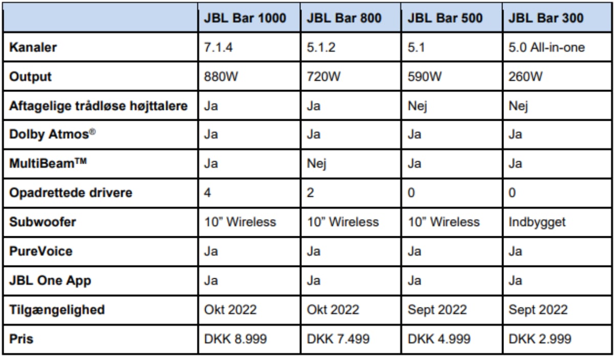 JBL Bar 300, Bar 50, Bar 800 og Bar 1000 hedder de nye modeller, som starter på 3.000 kroner og ender på 9.000 kroner. De skilter alle med Dolby Atmos, men man skal op i 800 og 1000 modellerne for at få den udvidede højedimension, som indhold i Atmos kan levere. DTS:X understøttes også.