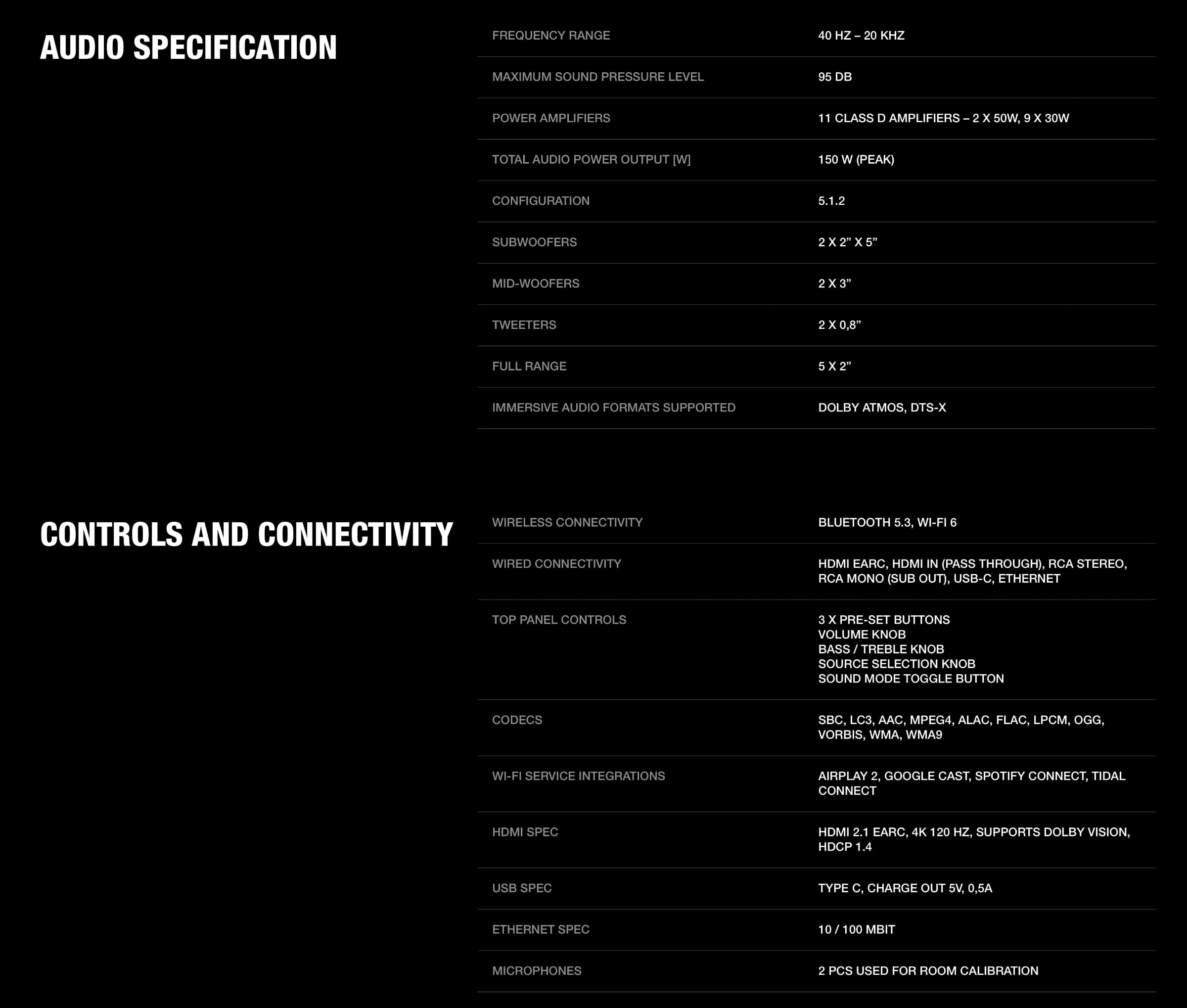 Marshall Heston 120 har 11 drivere indbygget, der skaber 5.1.2 kanaler, altså både side- og loftvendte enheder. Disse bruges blandt andet til Dolby Atmos og DTS:X, som begge understøttes.
