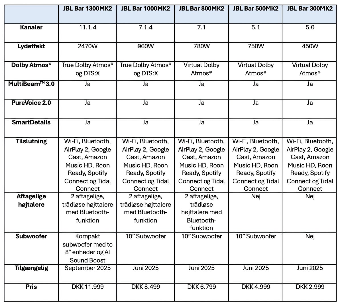 JBL Bar 1000MK2, Bar 800MK2, Bar 500MK2 og Bar 300MK2 er tilgængelige nu. Se tabellen nedenfor for danske priser og forhandlere samt specifikationer.