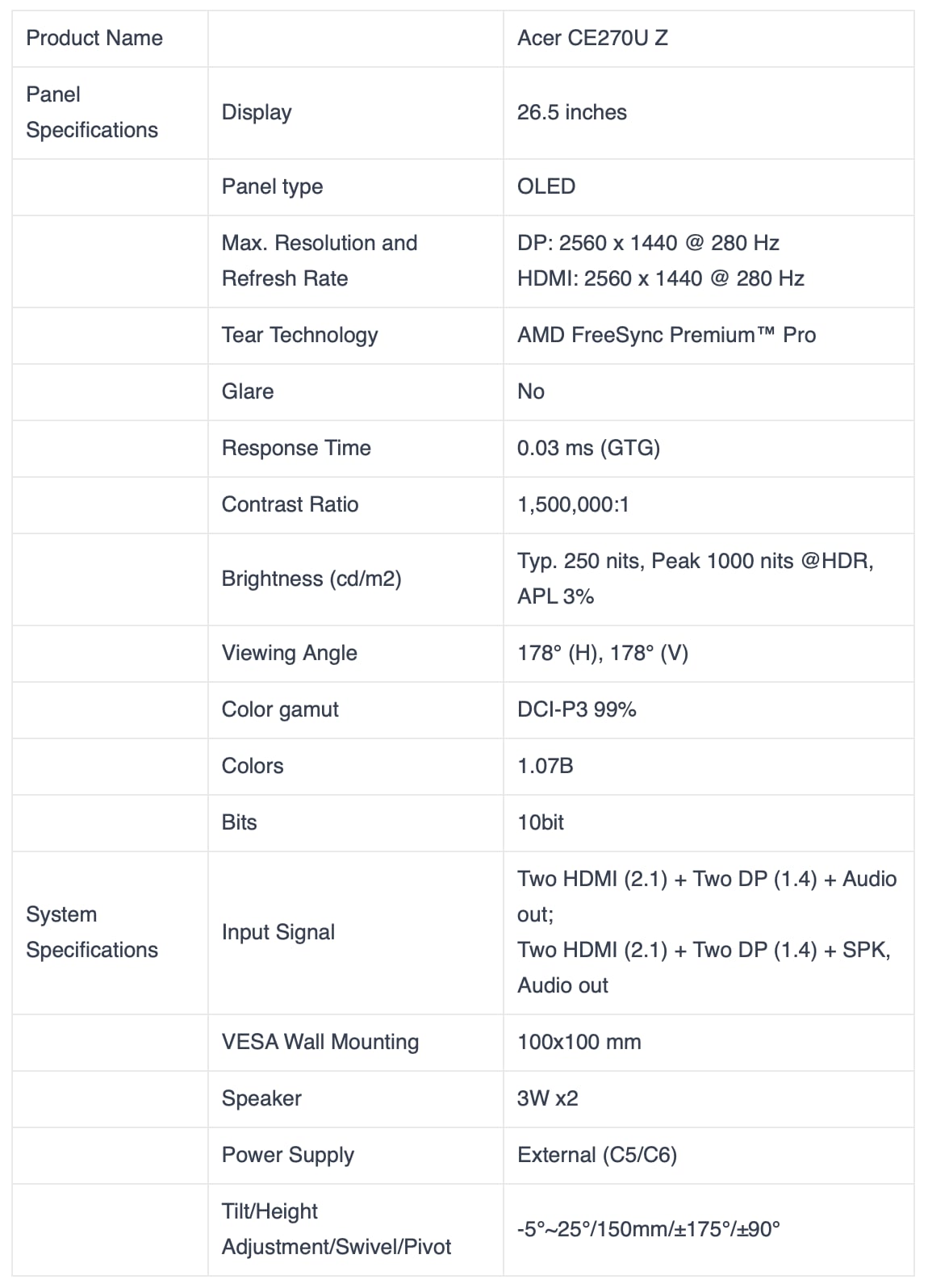 Derudover annoncerede Acer en 27-tommer CE270U Z, hvilket er en OLED-monitor med 2560x1440 opløsning og 280Hz opdateringsfrekvens. Det lader til at være et QD-OLED panel.