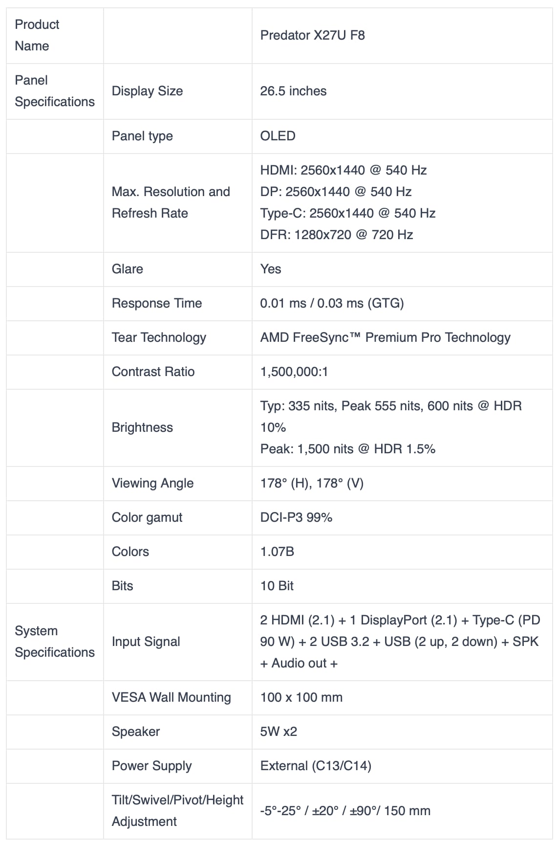 - "Predator X27U F8 leverer en fremragende spiloplevelse med en 26,5-tommer OLED-monitor, WQHD (2560x1440) opløsning og en imponerende opdateringsfrekvens på 720Hz. Takket være Dynamic Frequency Resolution (DFR) kan skærmen skifte mellem WQHD ved 540Hz og 1280x720 ved 720Hz, hvilket optimerer ydeevnen til forskellige spilsituationer," sagde Acer.