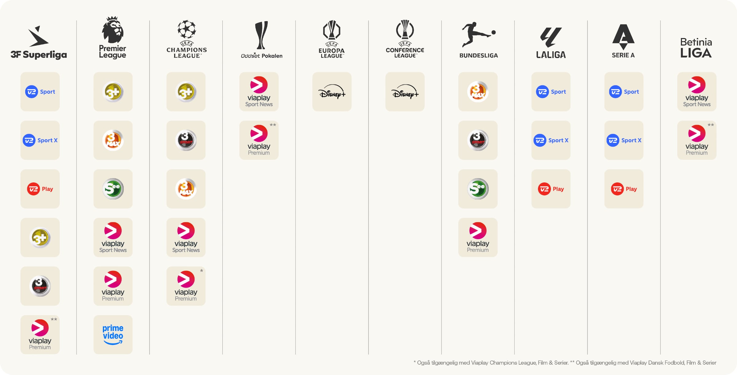 Det er Viaplays 'Dansk fodbold'- og 'Champions League'-pakker, som i dag den 19. november bliver tilgængelige som tilvalg i YouSee Play og Bland Selv.