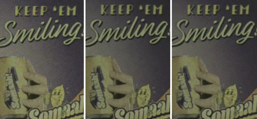 Samme (beskårne) billede fra kilden (venstre), almindelig AV1-stream kodet ved 8274 kbps (midten) og AV1 FGS-stream kodet ved 2804 kbps (højre). AV1 FGS-streamet reducerer bitraten med 66% og leverer samtidig markant bedre kvalitet. Foto: Netflix