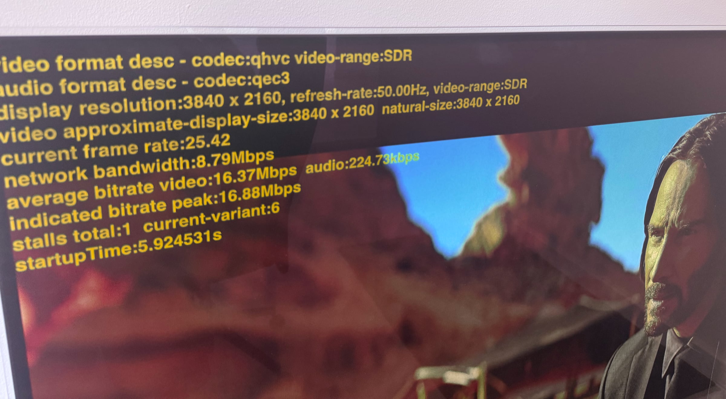 4K-videokvalitet på Viaplay. Foto/måling: FlatpanelsDe første lejefilm i 4K dukkede faktisk op på Viaplay for over et år siden. Dengang blev de imidlertid ikke streamet i mere end 1080p selvom et lille UHD-logo fremgik af brugerfladen. Viaplay oplyste i 2025 til Flatpanels, at det skyldtes tekniske problemer. Flatpanels har tjekket igen i dag og nu virker det som tiltænkt. Se foto til højre (