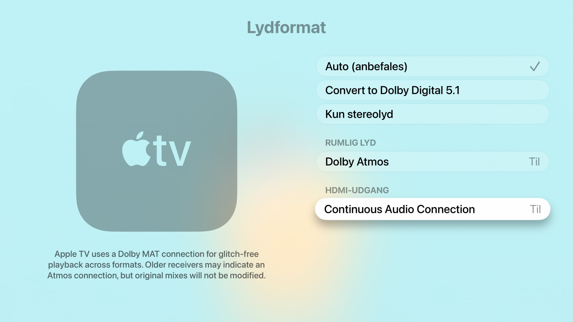 Lydfunktionen i tvOS 26.4 beta 1 hedder 'Continuous Audio Connection' – den er endnu ikke oversat til dansk – og gør hvad navnet antyder: Holder lydforbindelsen aktiv konstant.