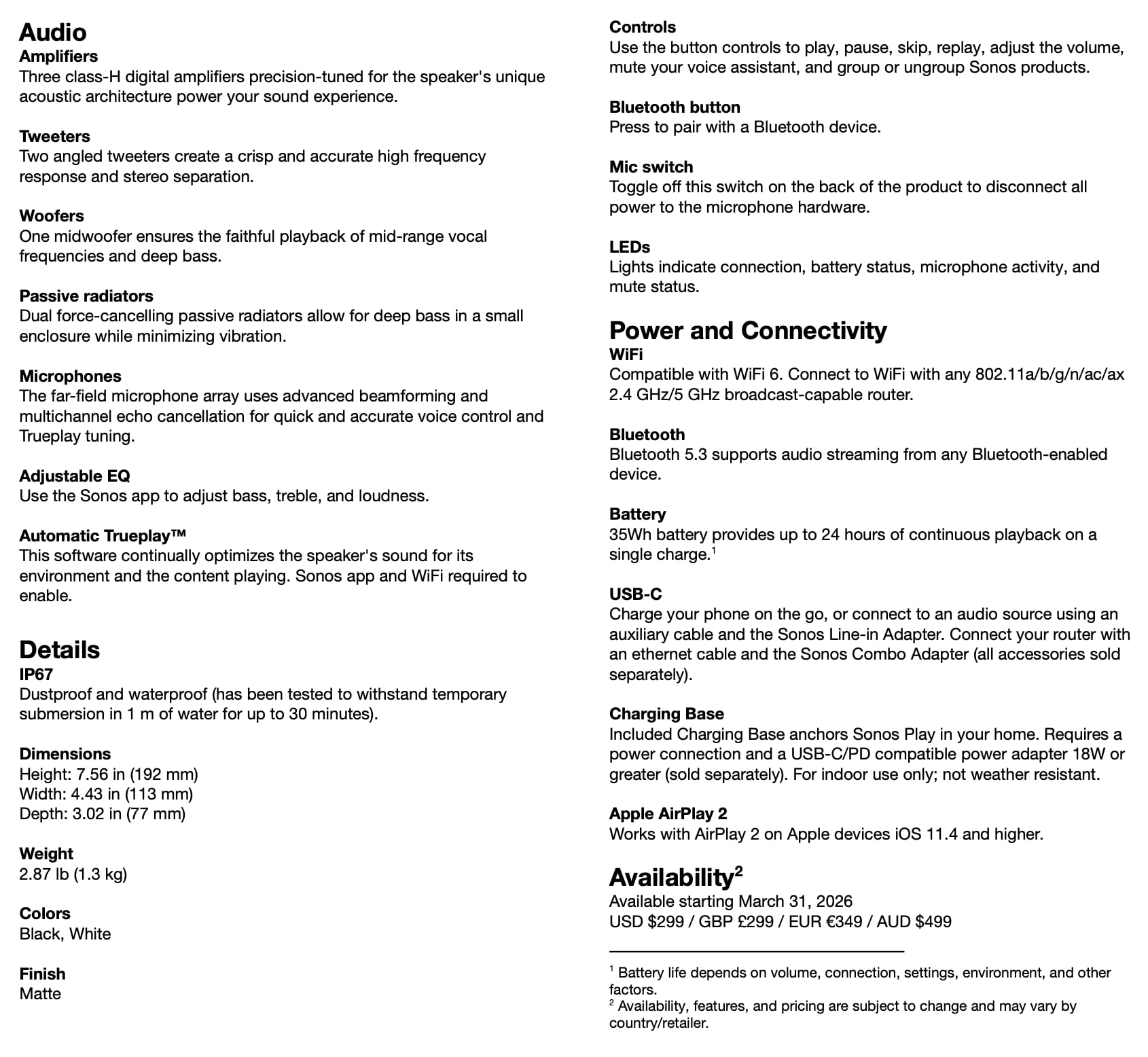 Sonos Era 100 SL og Sonos Play specifikationer